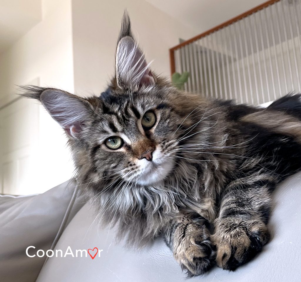 CH CoonAmor Zou Bisou Bisou is named after the French Yé-Yé song Zou Bisou Bisou. I adore her dramatic feral expression. She has a silky dark coat, dramatic lynx tips on tall ears, a strong chin and square muzzle, beautiful profile and an extra long tail. She is a gentle, inquisitive character and passes these qualities on to her kittens.